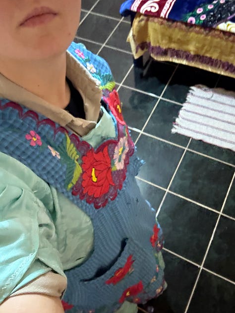 El primer día en el taller, al acomodarnos para empezar a trabajar, Chavela nota que mis tenis estorban, no tengo mandil y un vestido sería más práctico para sentarme en el suelo. Me llevó a un cuarto que solo tenía un armario lleno de vestidos y delantales de colores intensos. Sus hermanos le han mandado las telas desde Estados Unidos. Me escoge uno verde azul, me lo mido, me miro en un espejo, escoge un mandil, —ahora sí Laura. Sonríe. Me siento como la quinceañera que nunca fui.