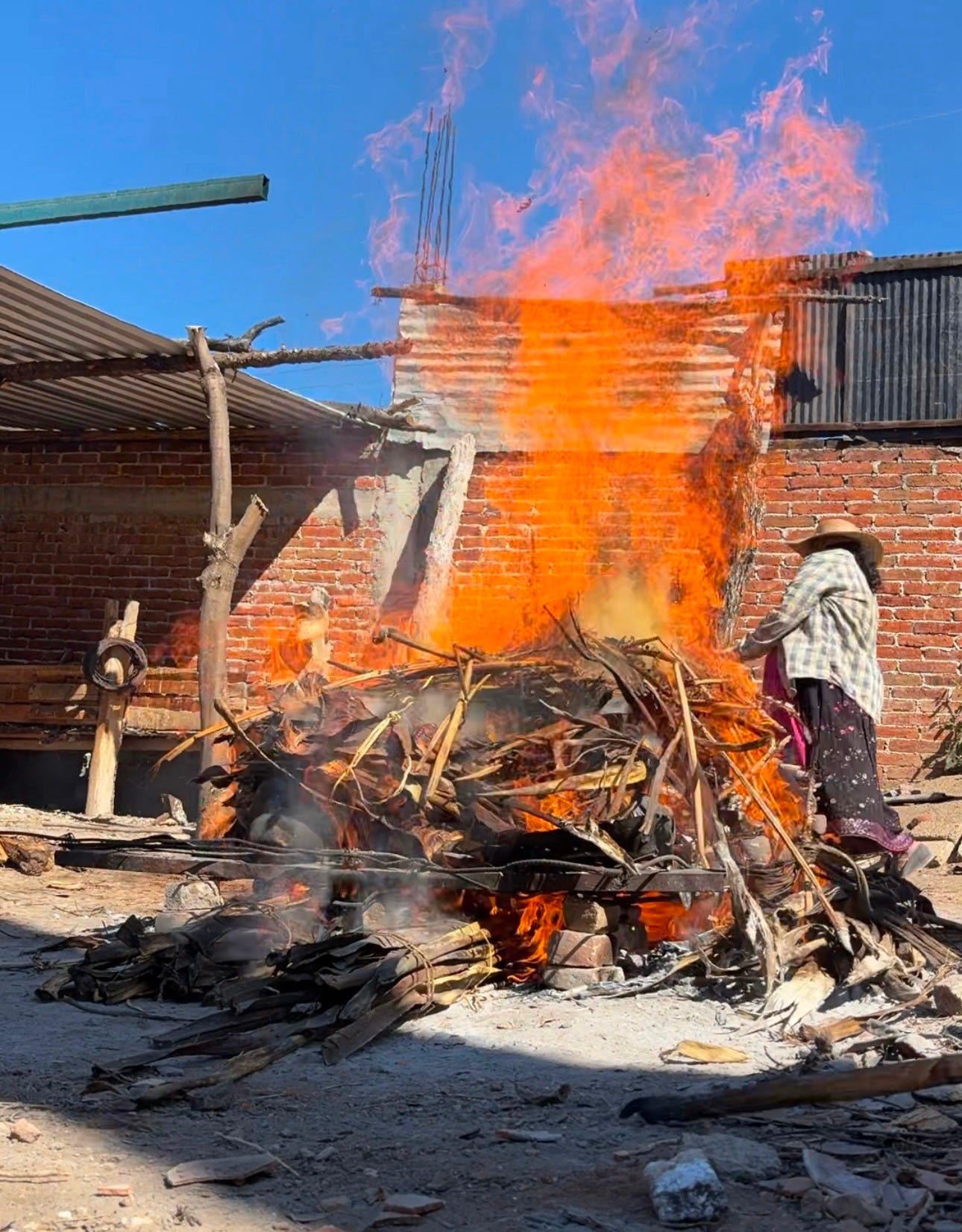 Como edredón: la leña. Primero trozos de la penca del maguey seco, y pura baraña. Chavela se va un rato y vuelve con sombrero, camisa leñadora y una mascada para la cara. Yo me envuelvo un trapo en la cabeza. Sin palabras ceremoniales, por una de las patas mete algo de paja y se prende el fuego. Metemos palos largos de bambú delgado por cada hueco del piso, que se ven metiendo a medida que se van consumiendo.