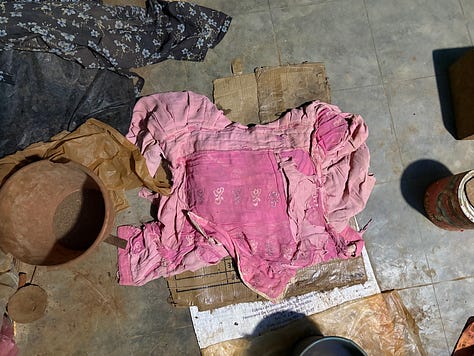 Estas prendas, brillantes y sedosas, luego de una vida recolectando barro, pizcando maíz, ido al pueblo o recogido aguacates, de haber llevado el contacto directo con la piel de un humano; al sentirse viejas se convierten en “trapas” (femenino del trapo), posan con sus variadas funciones en el taller y la casa, cubren las piezas del polvo, cuidan que se sequen despacio, ahora soportan el peso del cuerpo como cojín o se vuelven tapete. Siguen sosteniendo el cuerpo, ahora también del barro.