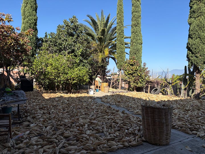 Me esperaba con las puertas abiertas, vestida de satín rosa con lentejuelas plateadas, y un solar cubierto de mazorcas que pizcaron la semana pasada y que su papá deshojaba todo el día. Me recibe con tejate. Me instalo en mi amplio cuarto que queda pasando por el cuarto de ellos, donde también está el televisor que reúne a la familia en la noche. Cenamos comida china, pasta con brócoli y zanahoria, a cambio de salsa soya, salsa picante. Comida extranjera para recibir al extranjero, —quién sabe si le gusta lo de aquí.
